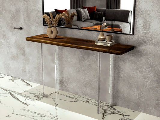 Our acrylic console tables offer a sleek, modern aesthetic with crystal-clear transparency and wooden or chrome accents, making them perfect for entryways, living rooms, or hallways. Designed for both style and function, each acrylic console table provides a durable, minimalist surface that enhances any contemporary or minimalist space.